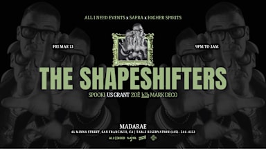 Friday, Mach 13th All I Need Events & Safra invites you to a special night with THE SHAPESHIFTERS at MadaRae. ► LINEUP THE SHAPESHIFTERS Spooki Us Grant Zoë b2b Marc Deco ► GUEST LIST, TICKETS & TABLES For Bottle Service and Table Reservations, please text: 📲 (415) 684-5045 All ticket sales are final and non-refundable. ► FOLLOW US Instagram: @allineedevents Facebook: @allineedevents ► HEADLINER BIO THE SHAPESHIFTERS From humble beginnings to working with Billy Porter, Joss Stone, Kimberly Davis and Teni Tinks, it’s been quite a ride, taking in teenage raving, mammoth DJ tours, seminal residencies in London and Ibiza, a global smash hit, being mentored by Frankie Knuckles and Simon Dunmore – and after many a testing moment, both musical and personal, finding a spiritual home in the Glitterbox family, the inspiration for a string of dynamic releases. After falling in love with electro, and then musically coming of age with the rave scene, Marlin gravitated towards “the US house sound, the funkier house sound.” Progress was rapid, the success of his Pure Filth night in Leicester firmly put him on the map as a DJ to watch, catching the eye of the Journeys by DJ crew. A stint as their tour manager was followed by a move into A&R, including helming Peppermint Jam’s London office. “I was getting the itch to start making tracks myself” says Marlin. He called one of his then clients, Max Reich and said “we’re going in the studio tomorrow, I’ve got this idea, I think there’s something in it. And that was ‘Lola’s Theme’.I wasn’t sitting there thinking ‘this is a smash hit record’ – this was just a record I wanted to dance to.” As with many house artists who’ve experienced crossover success, the Shapeshifters found it a mixed blessing.“Getting caught up in the major label machine was like riding a wild horse. I loved touring, getting to do amazing shows – and having people like Pacha, Cream, Amnesia wanting you to play for them. But that started to take away from the core of what I should have been concentrating on, which was music. Signing to Defected came about because I’d never, ever stopped wanting to be a Defected artist.” Defected’s Simon Dunmore wasn’t the only high-profile Shapeshifters fan who had been waiting in the wings for the right moment to approach the duo, as Marlin recalls with understandable pride. “The phone rang in the studio, ‘hi Simon it’s Frankie Knuckles - I’m playing in London, and I’d love you to come by, maybe we could grab some dinner.’ That's who I aspire to, because he turned around to me personally and said, ‘you can do this’. We became good friends and stayed good friends ‘til the day he died.” The Glitterbox party ship set sail in Ibiza in 2014, determined to bring some colour and flamboyance back to the White Isle, while providing a musical alternative to the then dominant tech and EDM soundtrack. “Simon mooted the idea to me, and I was like, ‘yeh man I’m all over that’. “The Terrace at Space was when the magic started to happen. Then at Hi, it went to another level again – that’sbecause all the Glitterbox family have invested themselves into it genuinely.” It’s easy to argue that the Glitterbox story has in no small part driven Disco back to the cutting edge of dance music once again, with fresh new talent in the genre coming through all the time. It’s a scene in rude health, now switching on an ever younger fan base and with Marlin being one of the beating hearts of it, it’s easy to see why The Shapeshifters are more in demand in the clubs than ever. In 2017, the Marlin / Reich partnership split, and when Glitterbox became a label as well as a club night, it was a logical home for the revamped Shapes Sound. “I knew exactly what I wanted to do, and thought, this is the platform for me. I started to make records for the Glitterbox dancefloor. All the ducks started to line up. I’ve got more engaged fans now than I did with the ‘Lola’s Theme’ era.” Key to this, through the pandemic, was the Sunday Service stream on Twitch. “People's emotions during that period went to some dark places, it was very important to have that sense of community. What I loved about it was it was all around the music. I can honestly say it was one of the most positive experiences of my career”. Covid may have slowed down the completion of Marlin’s long-awaited album, which had begun with Simon and his right-hand man Colin Smith (“genius, multi-instrumentalist, the man who understands my brain better than anybody”) heading Stateside to immerse themselves in writing, but the extra time ultimately afforded Marlin the ability to craft a masterpiece. For Let Loose Marlin was both able to showcase his own revered flair for production and writing, as well as bring together a group of incredible and diverse talent. “I'm a facilitator of talent. I'm blessed that over the years I've managed to put a team of people together - as a producer, that's what I do, very much in the old school sense like a Quincy Jones or Gamble & Huff, they’re the guys I try to emulate - and make something magic out of nothing, but do it in a contemporary way. That’s what really floats my boat, and that's what this whole project is about. “ Let Loose landed via Glitterbox Recordings to wide-spread acclaim in December 2022. Amassing almost 20 million streams in its first month of release, it was clear Marlin and his team had another success story on their hands. The record, like the artist, transcends the vagaries of the dance music world, holds true to its roots and yet remainsrelevant and forward-thinking. With the success of Let Loose, The Shapeshifters was in higher demand than ever in 2023. Touring the globe, Marlinand his sound graced dancefloors from Europe to Australia, North and South America and everywhere in between. Never one to rest on his laurels, Marlin took the opportunity to 