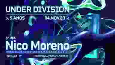 Under Division 5 anos apr. Nico Moreno | 4 de Novembro | São Paulo - SP || A espera finalmente acabou 🔥 || Você é nosso convidado especial para uma das noites mais esperadas de 2023! Após quase um ano de hiato, nosso aniversário de 5 anos está com data marcada e é com muita alegria que anunciamos que nosso reencontro acontece em poucos meses ao lado do francês, que se apresenta pela primeira e única vez no Brasil, Nico Moreno || Line-up completo Nico Moreno Ananda Martinelli (Live) Melanie Havens Unpurged vs Matheus Rocha || Performances Katrevosa Sam.gee || Local Arena X9 Paulistana - Tv. Casalbuono - Vila Guilherme || Mais informações no nosso perfil do Instagram @‌underdivisionsp!