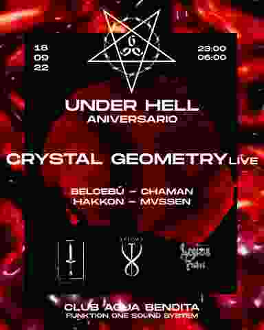 UNDER HELL ANNIVERSARY We present Crystal Geometry one of the most outstanding artists of Sacred Court who in live format will give us a night to remember, accompanied by great local artists such as Mvssen, Belcebú, Chaman and Hakkon. September 18 from 11:00 p.m. at Club Agua Bendita. UNDER HELL ANIVERSARIO presentamos a Crystal Geometry uno de los artistas mas destacados de Sacred Court quien en formate live nos dara una noche para recordar, acompañado de grandes artistas locales como Mvssen,Belcebú,Chaman y Hakkon. 18 de Septiembre desde las 23:00 en el Club Agua Bendita.