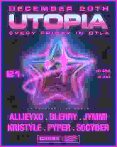 Welcome to UTOPIA Experience a night where the music, energy, and vibes align under one roof. Electric Jungle brings you a brand-new weekly escape to Downtown Los Angeles, taking over every Friday night for an unforgettable journey into sound and celebration. Prepare to lose yourself to thumping basslines, hypnotic rhythms, and futuristic visuals as we transform the night into a high-energy utopia. Dance until sunrise with an incredible lineup of DJs: Alliey XO, Blerry, Jymmi, Kristyle, Pyper, and Socyber Each artist will take you on a sonic adventure, blending house, techno, and underground beats that keep you moving until 4 AM. 📅 Date: Friday, December 20th 🕙 Time: 10 PM - 4 AM 📍 Location: DTLA (Downtown LA) 🔞 21+ Join us and be part of the Utopia experience – where Fridays belong to the music, the people, and the magic of the night.