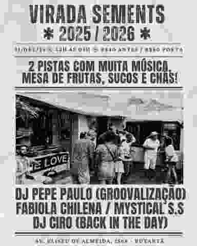 Virada Sements 2025/2026 Depois de 3 anos retornamos com a festa da Virada trazendo muita música em 2 pistas de som, diversos ambientes , rodeados de natureza e Djs soltando o som deslizando pelas Brasilidades, Cumbia, Groove,R&B, Rap, Reggae e muito mais ! + Mesa de Boas vindas para se refrescar com frutas, sucos e chás > Disponível das 23h a 01h < Line up : DJ Pepe Paulo (Grovalização) Deejay Ciro (Back in The Day) Mystical Sound System - Lady Moon + Biduzera Dj Fabiola Chilena Pista principal (proximo ao bar) Pista Mirante ( Mirante da casa) Bar externo / Interno Das 22h a 05h Antecipados: 40,00 Na porta: 60,00 Vendas de fichas para o bar diretamente no caixa da Casa Sements💚 Serviço de bar: Drinks com ou sem álcool Cerveja 600ml (diversas opções) Vinhos Variedades de opções sem álcool Vem virar na casinha e iniciar o ano renovando as energias 🌿 Sejam bem vindes 💚