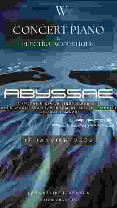LIVE PIANO / ELECTRO-ACOUSTIC AVEC LECTURES DE MARIE BRAND/MERYEM AL JABLIA Inspiré par la volonté de créer un espace onirique détaché de la matière et du temps, W est pensé comme un voyage sensoriel à la croisée du rêve et du réel - un portail - au travers d’une expérience audiovisuelle immersive. Abyssae [Theophile Simon] propose une traversée musicale où le piano, au centre de la scène, devient le cœur battant d’un univers en expansion : une matière sonore vivante, entre improvisation, composition et création audiovisuelle. Autour de lui, un éco-système se déploie : images mouvantes, voix, danse et lectures poétiques. Son langage, nourri d’inspirations variées, trouve ses origines entre Joe Hisaishi, Arca et Yann Tiersen, tissant un pont entre émotion pure et exploration électronique, entre classique et expérimental. PREMIERE PARTIE PAR LAVANDE BAR / RESTAURATION SUR PLACE Host by La Fontaine d’Ananda