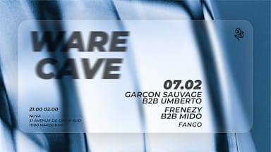 🚨WARE CAVE IS BACK🚨 Après un été exceptionnel, la WARE CAVE est de retour sur Narbonne pour l'année 2026 ! Pour cette nouvelle édition, la WARE CAVE collabore avec un TOUT NOUVEAU LIEU : NOVA. 🏝️ AU PROGRAMME: ● UNE LINE UP 100% LOCAL DE VOS ARTISTES PRÉFÉRÉS 🕺 ● NOUVEAU LIEU 👀 ● PRODUCTION BY GWEP ● FORMAT BOILER ROOM ● SYSTÈME SON PUISSANT 🔊 ● STAND MERCH 👕 ● ACCÈS AFTER IMPREVU GRATUIT (sur présentation du billet) 🎫 -------------------------- ⚠️ RÈGLEMENT: ▪️ Évènement uniquement réservé aux personnes majeures. ▪️ Une RAVE est un lieu où chacun doit se sentir en sécurité. Tout comportement dérangeant autrui, violence verbale ou physique entrainera automatiquement son expulsion. ▪️ Pour votre sécurité une fouille obligatoire sera effectué à l'entrée -------------------------- 👤TIME TABLE: 🕝 21H00-21H30 : OPEN PLATINE 🕝 21H30-23H00 : FANGO 🕝 23H00-00H30 : UMBERTO B2B GARÇON SAUVAGE 🕝 00H30-02H00 : MIDO B2B FRENEZY -------------------------- ℹ️ INFORMATION: * BILLETERIE EN LIGNE OU SUR PLACE *SAM 07 FÉVRIER *21:00-02H:00 * LIEU : NOVA NARBONNE (ancien sport bar à coté du repaire) 51 Av. de Croix S, 11100 Narbonne