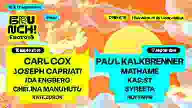 Après une première édition en 2017, le Brunch Electronik fait son grand retour à Paris ! Né il y a 10 ans à Barcelone, le Brunch Electronik réunit le dimanche, familles et amateurs de musique électronique dans un parc emblématique de la ville. Il est ensuite parti à la conquête d’autres villes européennes : Madrid, Lisbonne, Malaga… Adepte des line ups imposants, ce sont les meilleurs artistes du moment qui font danser les brunchers. Pour cette nouvelle édition, le Brunch Electronik s’étend sur 2 jours au célèbre Hippodrome ParisLongchamp : Samedi 16 septembre : CARL COX - JOSEPH CAPRIATI - IDA ENGBERG - CHELINA MANUHUTU - KATE ZUBOK Dimanche 17 septembre : PAUL KALKBRENNER - MATHAME - KAS:ST - SYREETA - HEN YANNI