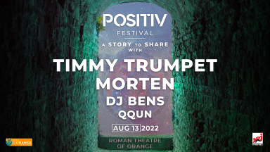 Le Positiv festival et la ville d'Orange vous donnent RDV le 13 août, au Théâtre Antique d'Orange W/ TIMMY TRUMPET, MORTEN, DJ BENS et les très prometteurs QQUN, BOVALON & CHRIS WILLSMAN en 1ere partie, pour une soirée qui promet d'être explosive !