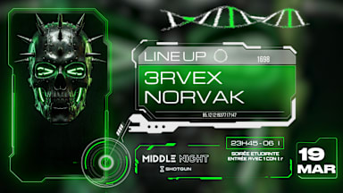 ⛓️Jeudi 19 Mars - 3RVEX x NORVAK⛓️ Chaque jeudi, la soirée étudiante techno incontournable de Clermont-Ferrand ________________________________________ 🎵 LINE-UP ▀▀▀▀▀▀▀▀▀ ⚡️ 3RVEX ⚡️ NorvaK ____________ 📍 INFOS PRATIQUES ▀▀▀▀▀▀▀▀▀ 🗓️ Date : Jeudi 19 Mars 2026 🕒 Horaires : 23h45 – 06h00 🎫 Préventes prioritaires jusqu’à 1h ⚠️ Nombre de préventes limitées ! ⚠️ Fermeture billetterie en ligne à 23h30, entrée sur place possible 📍 Lieu : Middle Night — 12-14 Rue Ramond, Clermont-Ferrand 🚋 Tram : Arrêt Lagarlaye (2 min à pied) 🚗 Parking : Centre Jaude 1 (5 min à pied) La nuit est à vous, vivez-la sans excès !!! Celui qui conduit, c’est celui qui ne boit pas. L’abus d’alcool est dangereux pour la santé, à consommer avec modération.