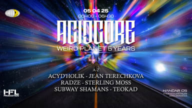 SAM 05.04.2025 ACIDCORE - WEIRD PLANET 5 YEARS w/ ACYD’HOLIK / JEAN TERECHKOVA / RADZE / STERLING MOSS / SUBWAY SHAMANS / TEOKAD HANGAR DS - 17 Rue Edouard Faure, 33300 Bordeaux 00h00 - 06H30 𝗧𝗶𝗰𝗸𝗲𝘁𝘀 : Prévente en ligne EARLY : 12€ + frais de loc. PHASE 1 : 15€ + frais de loc. _______________________ 𝗟𝗜𝗡𝗘-𝗨𝗣 𝗔𝗥𝗧𝗜𝗦𝗧𝗘𝗦 ACYD’HOLIK