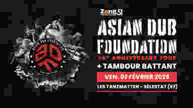 Asian Dub Foundation fête cette année ses 30 ans d'existence à Sélestat ! Retrouvez le mythique groupe anglais vendredi 7 février 2025 aux TANZMATTEN de Sélestat pour célébrer ensemble leur histoire solide et militante avec un show exceptionnel d’1h30. La musique d’Asian Dub Foundation est un genre en soi. Leur fusion unique de rythmes jungle, de lignes de basse dub, de guitares sauvages puisant dans leurs racines sud-asiatiques et de rap militant. En première partie, le duo Tambour Battant, en plein lancement du nouvel album "Welcome" viendra électriser la scène des Tanzmatten. Tambour Battant est issu de cette génération de beatmakers qui font tomber les cloisons entre les styles. Depuis une dizaine d’années, les deux producteurs n’ont de cesse de scruter l’horizon musical et d’y prendre le meilleur : electro, bass music, house, hip-hop, dub, trap… *** ATTENTION – Places limitées ! *** Pour les ENFANTS l'entrée est GRATUITE JUSQU'À 11 ANS INCLUS. Il suffit de vous présenter à la billetterie pour retirer un billet gratuit.