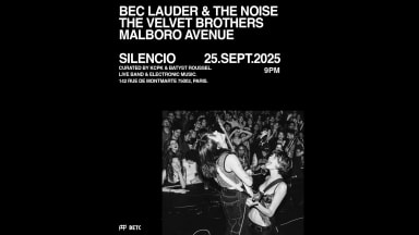 BEC LAUDER & THE NOISE THE VELVET BROTHERS MALBORO AVENUE SILENCIO 25.SEPT.2025 CURATED BY KCPK & BATYST ROUSSEL. 9PM LIVE BAND & ELECTRONIC MUSIC. 142 RUE DE MONTMARTE 75002, PARIS.