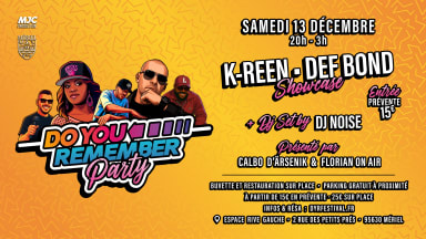 🎉 Soirée de lancement du DO YOU REMEMBER Festival – Mériel 🎶 Retrouvez-nous pour la soirée de lancement officielle du DO YOU REMEMBER Festival à Mériel, dans une ambiance 100 % souvenirs ! Au programme : ✨ Deux showcases exceptionnels : K-Reen et DEF Bond 🎧 DJ Noise aux platines pour vous ambiancer toute la nuit 🎤 Une soirée présentée par Calbo (Ärsenik) et Florian On Air 📍 Espace Rive Gauche – Mériel 📅 Vendredi 13 décembre 🕗 De 20h à 3h Venez vivre une première soirée inoubliable avant le grand festival… et replongez dans l’esprit DO YOU REMEMBER ! 💃🕺