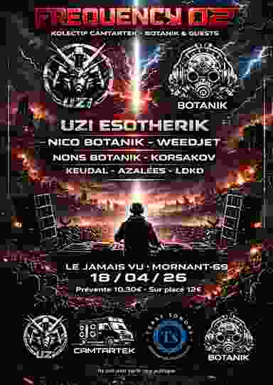 Pour cette deuxième édition terre sonore vous présente FREQUENCY 02 Des anciens artistes des nouveaux également, cette édition promet d'être explosif.Le talent sera bien présent avec Nicobotanik,weedjet Eklectiklab's et bien d'autres entre mix et live machine qui vous feront monter la sauce toute la soirée au rythme tribe hardcore hardtek il y en aura pour tout les goûts et pour finir en apothéose Uzi esotherik un des meilleurs artistes tribe du moment prendra le contrôle du vaisseau. Prépare tes chaussures 👟 elles vont être usées 🎟 Prevente 10,30€ 🎟 Sur place 12€ jusqu'à minuit , CB et espèces accepter ➡️Le jamais vu Mornant 234 Rue de la Garennière, 69440 Mornant Parking en ZI dans la rue devant l'établissement Accès en camion ok Accès entrée handicapés ♿️ ok A 20 min de lyon A 30min de Saint-Étienne ➡️accès autoroute A47 sortie givors direction Mornant Start 18h 🔊Indoor système 10kw 🍕Bar et restauration sur place planches charcuterie fromage et distributeur de pizzas Line up 🎧🔊🏴‍☠️ 18h-19h dj keudal 1'sub'ordonnés (tekno) 19h-20h Azalées Pica DK'p (tribe hardtek) 20h-21h LDKD (acid mental tribe) 21h-22h Nons Botanik (tribe hardtek) 22h-23h K0rsak0v (hardtek hardcore) 23h-00h weedjet Eklectiklab's(tribe hardtek) 00h-1h Nico Botanik (tribe) 1h-3h Uzi esotherik (tribe) A la dernière vous avez mis le 🔥 on compte sur vous pour la prochaine à très vite liens artistes Uzi⬇️ https://on.soundcloud.com/WRqWtctXm8GlyrDKsW Nico Botanik⬇️ https://youtube.com/@nicobotanik8180?si=shI20pGUqkpD38yH weedjet Eklectiklab's⬇️ https://on.soundcloud.com/ylQzaP4ywiRRFu9DkL K0rsak0v ⬇️ https://on.soundcloud.com/f7jFjIlX472QE7dwkv Nons Botanik⬇️ https://on.soundcloud.com/k9ZOfVDN9mba1cKcGR LDKD⬇️ https://on.soundcloud.com/37uTg5IKlkBsbqWpHY Azalées Pica Dk'p⬇️ https://on.soundcloud.com/S9MPIY45M7ci0brzeR dj Keudal 1'sub'ordonnés⬇️ https://on.soundcloud.com/9oY1seU5hqvPRpULKS