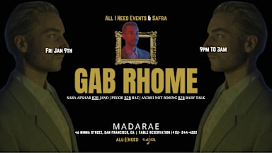 Friday, January 9 - Gab Rhome All I Need Events invites you to a special night with GAB RHOME at MadaRae. ► LINEUP GAB RHOME Sara Afshar B2B Jano Pixxie B2B Raz Andrii Not Boring B2B Baby Talk ► GUEST LIST, TICKETS & TABLES For Bottle Service and Table Reservations, please text: 📲 (415) 684-5045 All ticket sales are final and non-refundable. ► FOLLOW US Instagram: @allineedevents Facebook: @allineedevents ► HEADLINER BIO Gab Rhome has an innate sense of rhythm, emotion, and groove. Both as a producer and DJ, the artist sparks an unavoidable connection with the soul, while conveying exceptional personal style and a sense of fun. Rhome is known for his eclectic live sets, which are percussion driven and juggle with tribal, house, techno and disco: Gab strives to always be different, never boring. His sensual approach to life and music includes all the arts – literature and poetry, textiles and fashion, visual art, and cooking, for which he sources spices and flavorings on his DJ Travels. Charting releases on illustrious labels such as Disco Halal, Club Bad, Anjunadeep and All Day I Dream have helped Gab progress globally while maintaining artistic credibility. Performances in festivals and venues such as Space Miami, T omorrowland, Burning Man and the Brooklyn Mirage, have gifted Gab with a rich understanding of how to entertain large crowds. With his talent and intense working methods, it’s unlikely that he will run out of worlds to conquer. MadaRae Nightclub 46 Minna Street, San Francisco 9PM – 3AM | 21+ with valid ID #LETSDANCE