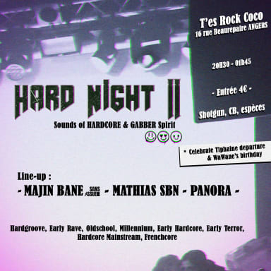 Rendez-vous Jeudi 26 Juin pour cette Hard Night II ! Au programme : Acid Techno, Early Rave, Oldschool, Millennium, Early Hardcore, Early Terror, Hardcore Mainstream, Frenchcore, Uptempo Préparez vos meilleures chaussures et venez taper du pied au rythme des BPM ! -- INFOS -- - Lieu T'es Rock Coco, 16 rue Beaurepaire, Angers - Horaires : 20h30-01h45 - Bar sur place - Vestiaire sur place, et casier à partir de 2€ Toutes formes de discriminations ou de comportement inapproprié entraînera une exclusion et un bannissement à vie de nos événements. -- LINE-UP -- Majin_Bane (collectif Sans Issue) :