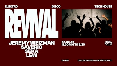 La Nuit x Revival Paris : replongez dans l'univers de la bloghouse, de l'électro et de l'électroclash lors d'une soirée unique à la Nuit 🎶 Revival Paris rallume la flamme d’une génération qui dansait sans filtre, sortez vos appareil photos compact, vos meilleures et vos plus belles vestes en cuir sans oublier vos Rayban Wayfarer - ici on est chic et on aime le faire savoir. let's get back in 2007 <3 CLUB 23h30-06h00 : Saverio Jeremy Weizman Lew Seka Posseder un ticket ne garantie pas le droit d'accès à l'établissement la direction se réserve le droit d'entrée. BE PART OF REVIVAL.