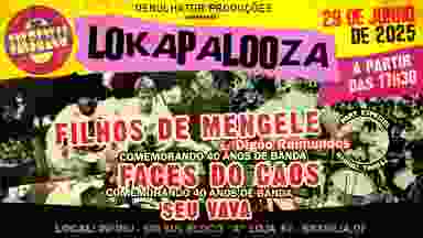 Lokapalooza edição 40 anos de Filhos De Mengele O Lokapalooza sempre vem inovando e nessa edição vamos com 40 anos de Filhos De Mengele. Pra quem não conhece o Filhos De Mengele é uma banda percussora do punk rock de Brasília, e quem tocava bateria era o Digão dos Raimundos. A banda tem diversos sucessos quem embalaram a cena por anos e nada melhor do que essa reunião que contará com Gabriel Thomaz do Autoramas tocando guitarra ou seja será imperdível. Também fazendo 40 anos teremos a Face do Kaos com seu punk rock que bate na orelha e ensurdece. E a festa vai ser completada pelo Seu Vavá misturando suas autorais com um tributo impecável dos Raimundos. Segue o cronograma abaixo 19