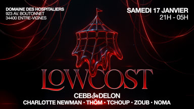 LOWCOST : NOUVEAU NOM / MÊMES VIBES 🗓️ SAMEDI 17 JANVIER 📍CHÂTEAU DES HOSPITALIERS - ENTRE VIGNES ⌚️ 21H - 5H LINE-UP : CEBB B2B DELON CHARLOTTE NEWMAN THOM TCHOUP B2B ZOUB NOMA 🎪