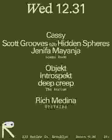 New Year's is always one for the books at 233. This year, we host 14 hours of sounds across the house and bass music spectrum from voices new and old. Cassy and her distinctive soul-meets-groove style headline The Sound Room. A trailblazing DJ whose career has surpassed two decades of vinyl-forward club culture, Cassy's collection, too large to be unearthed, is cemented by raw edges and steamy pads. Detroit house don Scott Grooves goes back-to-back with UK-based Hidden Spheres. From opposite sides of the pond, the two share a crate-diggers toolbox of Detroit house. Where Grooves brings the jazz, funk, and soul, Spheres touches synths, retro drum machines, and the blissed-out euphoria of early prog. Jenifa Mayanja sets the vibe. Her spiritual and organic take on deep house is derived from roots in East Africa and time as a thought leader in New York's underground, where she has been placing women at the forefront since the mid '90s through work as a DJ, producer, and label owner. In The Atrium, three individuals within the contemporary underground spin their unique takes on bass, UKG, and tech: Objekt makes his debut at Public Records. The Berlin-based artist is known for his crystalline, genre-defying productions, and his newly-minted label Kapsela follows suit with audacious, experimental club music. Just as beloved are his DJ sets, which tend to shapeshift between hard-charging bass and precision techno. Recognized by DJ Mag and Resident Advisor for her garage productions, Introspekt's early start in LA's dubstep scene has blossomed into a globally-renowned respect for her artistry as both a DJ and producer [T4T LUV NRG, Tempa]. Expect nothing less than a club-thumping start to 2026. Scene-staple deep creep completes her 2025 residency with a psychadelic, slow-build to midnight. The pi pi pi founder's reputation for ego-free, seamless, and intuitive DJing has made her a reliable favorite, whether pumping out sexy minimal or chugging through steamy late-night techno. Deemed a "modern-day renaissance man" by The Kennedy Center, Rich Medina is a sonic storyteller par excellence. UPSTAIRS, the platinum-selling record producer, poet, journalist, and Ivy League lecturer and his 50,000-strong collection takes us on a lesson through hip-hop, house, Afrobeat, funk, and soul, unearthing one musical gem after another. - Public Records aims to provide a safer space. We reject all forms of discrimination, including racism, misogyny, transphobia, homophobia, sexism, and other aggressive behavior. Consent is paramount. Please exist with respect for yourself and those around you. Anyone found in violation of our rules or safer space policy will be removed from the venue. To share feedback about an incident, please email hello@publicrecords.nyc or alert a member of our team. Limited tickets will be sold at the door. A ticket does not guarantee entry. Admission into the venue is subject to capacity and the discretion of our staff.