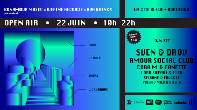 🎶 OPEN AIR - CITÉ BLEUE 🌀 🗓 Dimanche 22 juin 2025 | ⏰ 10h – 22h 📍 La Cité Bleue, 176 rue Achard, Bordeaux – Bacalan Un dimanche pas comme les autres s’annonce à Bordeaux ! Le 22 juin, au lendemain de la Fête de la Musique, La Cité Bleue t’ouvre ses portes pour une grande bouffée d’énergie électro, en plein air et en plein cœur du quartier Bacalan, sur l’ancien site mythique des raffineries Beghin Say. 🌞 Un open air solaire et accessible à toutes et tous, qui fait la part belle aux b2b de DJs affûtés, à la slow fashion, à la bonne bouffe et aux boissons locales (AVA Hard Kombucha 🍹). 🎧 AU PROGRAMME MUSICAL : 🔥 SVEN & DROV Un duo explosif et incontournable de la scène locale. Ce Duo incandescent mêlant house mélodique et techno progressive, experts en montées enivrantes et drops redoutables. 💖 AMOUR SOCIAL CLUB Ambassadeurs du dancefloor éthique et festif, ils distillent une house généreuse et des vibes inclusives. Leur b2b est un shot d’amour brut et contagieux. 🦁 LORD SAFARI & FISH Lord Safari & Fish, c’est deux diggers aux sélections fines et aventureuses. Leurs sets mêlent house organique, rythmes tribaux et pépites venues d’ailleurs, pour une transe élégante entre danse et introspection. 💃 CORA M & FANETTE Un duo Féminin et Solaire, elles distillent une rythmique allant de la micro-house à la minimal avec une sélection affûtée et une parfaite complicité en live . Passionnées de rythmes et de textures fines, elles tissent des sets subtils ,élégants et immersifs, où la finesse du mix rencontre la précision des transitions. 🌐 FRUCKIE & SEIBANE Deux diggers insatiables, amoureux du vinyle, qui construisent leurs sets comme des voyages entre house groovy, techno mentale et textures breakées. Leur complicité derrière les platines fait décoller chaque dancefloor avec précision et instinct. Explorateurs sonores entre techno hypnotique et break électronique, ces deux-là enchaînent les sets à l’énergie montante, parfaits pour les moments de bascule. 🧊 POLAR & NICH & DILOTA Pur concentré de micro-house et d’expérimentations groovy. Des artisans du son qui subliment les textures les plus fines pour un set matinal, tout en finesse, mêlant Micro-House Tech-House et atmosphères planantes. Une mise en route idéale, entre détente et élégance sonore. 🛍 Sur place : friperies, créateur·ices slow fashion, street food & boissons locales 🍹 Avec notamment AVA Hard Kombucha, partenaire principal, et ses recettes alcoolisées inédites en France 👨‍👩‍👧‍👦 Public ouvert : passionné·es d’électro, curieux·ses, familles, tout le monde est le bienvenue 🎟️ Réserve vite ta place pour cet open air unique à Bordeaux, entre passé industriel, présent électro et futur durable. Support press : @letypefr #openaircitebleue #electroinbacalan #openairbordeaux #slowfashion #kombuchaparty #shotgun