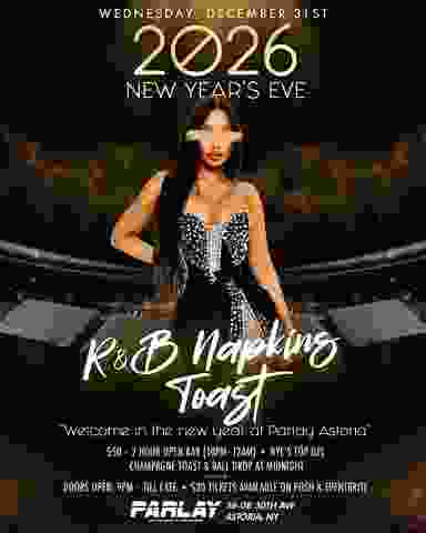 Welcome 2026 at Parlay Astoria, one of Queens’ favorite nightlife lounges, known for its stylish crowd and high-energy celebrations. This New Year’s Eve, Parlay Astoria hosts the official R&B Napkins Toast, delivering a full NYC-style NYE experience with premium drinks, top DJs, and a packed dance floor. Doors open at 9:00 PM as guests settle in for a night of nonstop music and celebration. Enjoy a 2-hour open bar before midnight, followed by a champagne toast and live ball drop as everyone counts down together. NYC’s top DJs will keep the energy high all night with R&B, Hip-Hop, Latin, Reggaeton, Pop, and party favorites. Whether you’re celebrating a birthday, bachelorette or bachelor party, anniversary, graduation, corporate outing, or simply New Year’s Eve itself, this Astoria NYE party is designed for unforgettable moments. Tickets are limited and this event is expected to sell out. Event Details Event: Parlay Astoria New Year’s Eve 2026 – R&B Napkins Toast Date: Wednesday, December 31, 2025 – Thursday, January 1, 2026 Time: 9:00 PM – 4:00 AM Location: Parlay Astoria, 36-08 30th Ave, Astoria, NY Admission: $20 – $50 Open Bar: 10:00 PM – 12:00 AM Includes: Champagne toast, live ball drop, top NYC DJs Celebrate New Year’s Eve in Queens with great music, premium drinks, and one of Astoria’s most vibrant nightlife crowds. Find more events at this Venue: https://mtsproductions.com/venue/parlay-astoria/