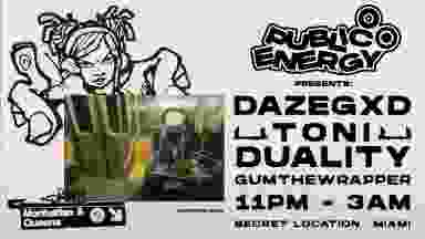 Public Energy is proud to present: The Miami installment of Dazegxd’s Exhibition Tour, featuring Toni, Duality & Gum The Wrapper. Expect hard hitting jungle breaks and euphoric melodies throughout the night. 21+ BYOB encouraged