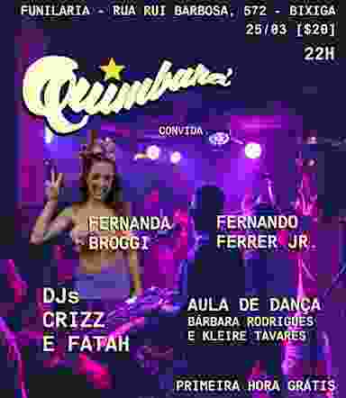 Toda quarta é latina na Funilaria com a Banda Quimbará e convidados no palco. Dessa vez a participação especial da noite é a cantora Fernanda Broggi. Alem, claro, da aula de dança no inicio da noite por Barbara Rodrigues e Kleire Tavares! Venham cedo para aprender todos os passos e esquentar o corpo! Para completar o time de peso, os Djs Crizz e Fatah dividem a pista do começo ate o final da madrugada! Garanta seu ingresso no link e venha Bailar :)