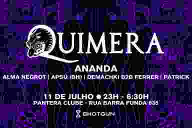 Atendendo a pedidos, nossa terceira edição será mais longa! Prepare-se para o nosso encontro mais intenso com um lineup memorável! -------------- Lineup: Ananda Alma Negrot Apsü (BH) Demachki Ferrer Patrick Performer: Arthur Cardoso Evento +18! Siga o perfil da Quimera no Instagram para se manter atualizado sobre as nossas edições: @quimerafesta -------------- A Quimera é uma festa que preza pela liberdade e respeito acima de tudo. Nenhum ato de discriminação ou assédio será tolerado. Caso seja vítima ou presencie alguma situação nesse sentido, procure imediatamente alguém da produção. -------------- Lista TNB: Será divulgado formulário na nossa página do Instagram para cadastro e solicitação da cortesia. Os dados serão analisados e a nossa produção entrará em contato via e-mail com a resposta da solicitação e, caso seja positiva, já com o ingresso.