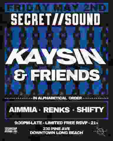 🔥 Downtown Long Beach — Friday, May 2nd 🔥 Join us for a night of cutting-edge house music featuring Kaysin and friends! Known for his Beatport-charting tracks and support from legends like Fisher, Tiësto, and Vintage Culture, Kaysin brings his signature sound to the city — joined by AIMMIA, SHIFTY, and Renks. 🎟️ Don’t miss this stacked lineup. THIS WILL SELL OUT and as always - the music and the dancefloor is priority one. This is a limited space event so don't delay and reserve your spot now. 🎟 LIMITED FREE entry with RSVP – don’t miss out! * LIVE ART INSTALLATIONS * Drink Specials * GOOD VIBES ONLY