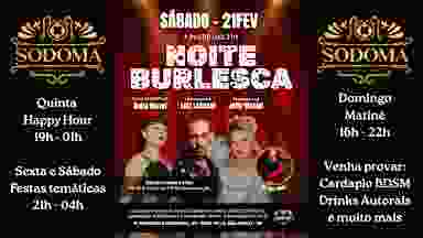 Sábado, das 21h às 04h, a Noite Burlesca transforma o Sodoma em um espetáculo de arte, charme e intensidade. A abertura fica por conta de Anita Nurmi, seguida pela performance envolvente de Jelly Maciel e a apresentação especial de Luiz Lobassi, criando uma atmosfera provocante e sofisticada, com direito a interação com o publico, não vai ficar de fora né! No comando da pista, DJ Max Stacy conduz o ritmo até o último minuto, elevando cada sensação, tocando house, idustrial, pop e rock, com aquele toque sedutor que o burlesco tem e nós amamos. Nosso espaço conta com salão de mesas para se deliciar com nosso cardápio BDSM e nossos drinks autorais, um lounge confortável para socializar e relaxar, uma pista de dança ampla com um palco iluminado onde acontece a magia, e também pode se divertir em nosso dark room com sling ou em nossa masmorra toda equipada com moveis e floggers para usar a vontade, sem falar em nosso fumódromo arejado e arborizado nos fundos. Um ambiente onde liberdade, estética e conexão se encontram em cada detalhe. Esperamos por você!