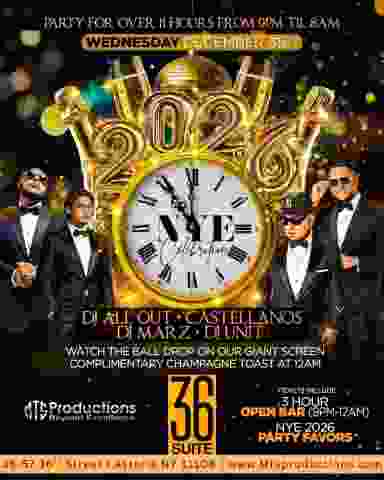 Welcome 2026 with one of the longest and most talked-about New Year’s Eve celebrations in Queens at Suite 36 Astoria. Located in the heart of Astoria nightlife, this all-night NYE party runs from 9PM until 8AM, offering nonstop music, premium drinks, and a high-energy crowd ready to celebrate well past midnight.