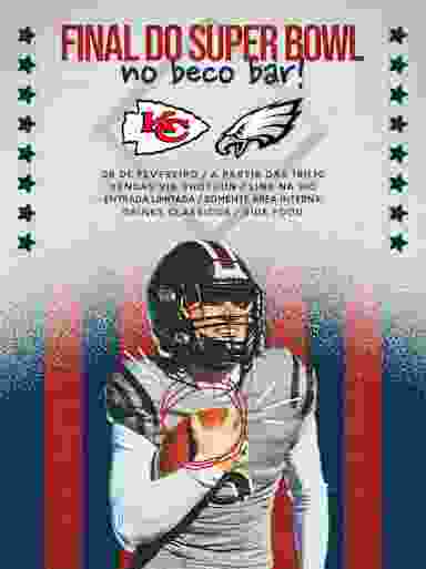SUPERBOWL LX é no Beco Bar. Drinks clássicos e soft food da casa. Valor: R$ 15 (quinze reais) + taxas adicionais da plataforma.