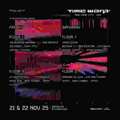 Time Warp US 25’ Brooklyn Storehouse November 21 / 22 2 nights - 2 rooms +21 Table Reservations: WhatsApp: +1 (718) 614-2563 Email: