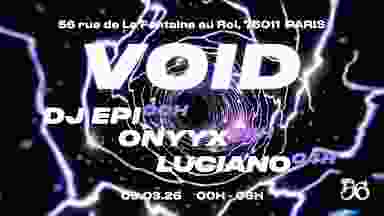 🌑 LUNDI 9 MARS 2026 – VOID 🌑 VOID revient pour hanter le creux de la semaine. Pas de répit, pas d’échappatoire juste une descente brute dans la matière sonore. La transe s’infiltre, lente puis implacable, jusqu’à faire parler les murs du Studio56. Quatre faiseurs d’ombres pour modeler le vide. Prépare ton corps : ici, on ne danse pas on disparaît. ▬▬▬▬▬▬ TIME TABLE ▬▬▬▬▬▬ 🌀 00H - DJ ÉPI IG : https://www.instagram.com/djepicurien SC : https://soundcloud.com/l-o-ddn 🔊 02H – ØNYYX IG : https://www.instagram.com/onyyx_music SC : https://soundcloud.com/onyyx-music-official 💥 04H – LUCIANO IG : https://www.instagram.com/prod_by_luciano SC : https://soundcloud.com/dj_lucianoo #InsomniaParis #Studio56 # Luciano # onyyx # dj epi #HardTechno #MentalTechno #DarkTechno #HypnoticTechno #TechnoParis #ParisRave #UndergroundRave #FridayRave #WeekendRave #NoSleepOnlyTechno #HardGrooves #SleeplessGrooves #WarehouseMood #FromMidnightToMorning #BassAndRituals #UndergroundTechno #ParisByNight #RaveCulture #TechnoAddict ▬▬▬▬▬▬ INFOS PRATIQUES ▬▬▬▬▬▬ 📅 Date : lundi 2 mars 2026 ⏰ Horaires : 00H / 6H 🎶 Styles : Techno / hard techno / Groove / Raw / Acidcore 📍 Lieu : Studio 56 56 Rue de la Fontaine au Roi, 75011 Paris Ⓜ️ M°3 – Parmentier Ⓜ️ M°5/8/9/11 – République Ⓜ️ M°11 – Goncourt ▬▬▬▬▬▬ 𝖳𝖠𝖱𝖨𝖥𝖲 & 𝖳𝖨𝖢𝖪𝖤𝖳𝖲 ▬▬▬▬▬▬ 🎟️ Early Members Tickets : 7,99€ 🎟️ Regular Members Tickets : 8,99€ 🎟️ Late Tickets : 10,99€ ✅ Tickets sur place : 13€ 🎒 Vestiaire obligatoire : 2,00€ ▬▬▬▬▬▬ RÈGLES DE VIE ▬▬▬▬▬▬ ⛔️ Tolérance zéro pour comportements racistes, sexistes, homophobes, transphobes 🔞 Interdit aux moins de 18 ans 💪 Aucune violence tolérée 📍 Respect du lieu et des autres 🏳️‍🌈 LGBTQIA+ friendly 💧 Bois de l’eau, prends soin de toi et de tes ami·e·s 💊 Sois attentif à ce que tu consommes 🚗 Ne conduis pas si tu n’es pas en état ⚠️ IMPORTANT ⚠️ L’entrée sera refusée à toute personne en état d’ivresse ou sous influence de drogues. Notre priorité : un espace safe pour tou·te·s. Aucune forme de haine ne sera tolérée. Rave libre, rave consciente.