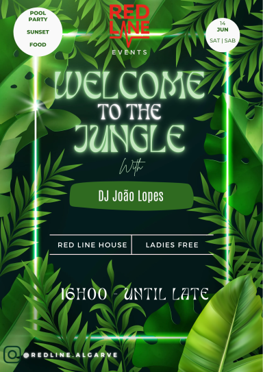 🐾 WELCOME TO THE JUNGLE 🐾 🗓️ 14 de junho | 17h00 📍 Red Line House (localização secreta) A selva chama. E não há sinal de civismo. Piscina, corpos molhados, e Afrobeats a ferver até o sol se render. 🎧 Sonoridade quente. Afrobeats only. 👙 Pool party com pouca roupa e muita atitude 🍹 Jungle bar para instintos primários 🦁 Dress code: selvagem, livre, sem filtros 🎟️ Bilhetes ultra-limitados. 📲 A morada só chega a quem entra no grupo de WhatsApp. ⚠️ Entra aqui antes de comprar: [inserir link] 🌿 Isto não é uma festa. É um delírio tropical com hora marcada.