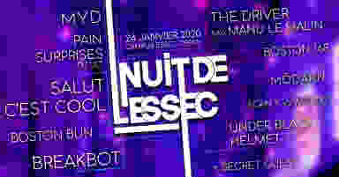 💥 CONSOS - 4€ LA PINTE DE BLONDE 🍺 La pinte : 4€ la Blonde - 5€ la Vedett - 6€ la Chouffe Shots : 3€ l'unité - 8€ les 4 - 18€ les 10 Cocktails : 6€ Redbull : 2,50€ Softs 2€ ▬▬▬▬▬▬▬▬▬▬▬▬▬▬▬▬▬▬▬▬▬▬ 👕 VESTIAIRE GRATUIT 🧥 ▬▬▬▬▬▬▬▬▬▬▬▬▬▬▬▬▬▬▬▬▬▬ ✌️ DE NOMBREUSES SURPRISES ✌️ Un coin chill out par Liquid, une salle d'arcade sous la main stage par Arcade Legends, un Event Car Red Bull, des Foodtrucks, un stand de maquillage et ... un secret Guest ! ▬▬▬▬▬▬▬▬▬▬▬▬▬▬▬▬▬▬▬▬▬▬ 🥳 ELECTRO, TECHNO, DISCO, HOUSE 🥳 🔈 Avec 3 scènes dont une totalement dédiée à la techno... Il y en aura pour tous les gouts à la Nuit de l'ESSEC ! 💥 Salut c'est cool – Myd – Pain Surprises Records – The Driver (Manu Le Malin) – Breakbot – Under Black Helmet – Boston Bun - Boston 168 – Möd3rn – SCAN X VS Wlderz - Secret Guest Le tout sur plus de 5 000 m² de dancefloor avec 10 bars à thème, c’est la Nuit de l’ESSEC qui revient pour sa 44ème édition le Vendredi 24 janvier 2020. ▬▬▬▬▬▬▬▬▬▬▬▬▬▬▬▬▬▬▬▬▬▬ 🚋 ACCES 🚋 ► 45 min depuis Chatelêt, RER A direction Cergy-Le-Haut, arrêt Cergy Préfecture, ► Kapten vous offre 2x50%* de réduction avec le code LANUIT2020, code accessible directement en cliquant sur ce lien : https://welcome.kapten.com/?promocode=LANUIT2020