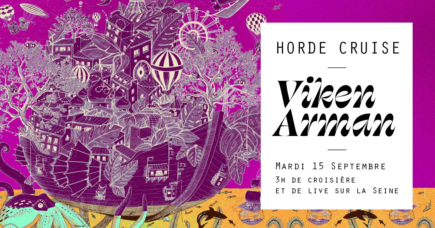 Surprise surprise !! Lundi 34° et grand soleil, on ne pouvait pas passer à côté d'une Horde Cruise… Mardi c'est Viken Arman qui prend le gouvernail !! On reprend les bonnes habitudes : ouverture des portes de la péniche à 19h pour chiller au soleil, départ à 20h30 pour une virée de 3h le long de la Seine. Rappel des consignes de sécurité : le port du masque est obligatoire dans tout le bateau, il ne peut être retiré qu'une fois assis. La capacité du bateau est plus limitée que d'habitude, ne trainez pas ! On a hâte de vous retrouver <3