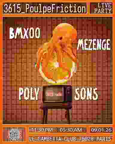 3615_PoulpeFriction — LIVE PARTY Le Gambetta Club, Paris 09.01.26 — 23h30 → 05h30 Encore une nuit où rien ne colle à part tes chaussure sur le sol du Gambetta club… BMX00 Doux sexy groovy, ta bouche parle encore que ton corps s’est déjà mis à bouger… Ça groooove ouais ! MEZENGE Tribal house. Tu pensais danser deux minutes ? Allons ? Vraiment ?? POLYSONS Garage / Acid. Pas là pour être Poly, juste pour finir le boulot. Pas de concept. Pas de morale. Juste du son jusqu’à ce que ça coupe et ce mystérieux Poulpe sur le Flyer