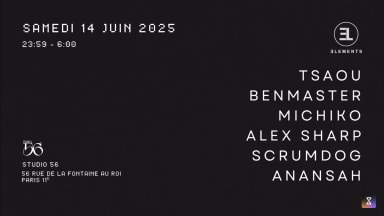 🎶 SAMEDI 14 JUIN 2025 - Ǝ L E M E N T S / Paris with Undrgrnd Amsterdam 🎶 Le 14 juin, l’univers d’Ǝ L E M E N T S débarque au Studio56, en collaboration avec Undrgrnd Amsterdam, pour une soirée électrisante où la techno brute et sauvage rencontre la vibe underground. Préparez-vous à une immersion totale dans un son percutant et des basslines intenses qui vont vous emmener jusqu’au matin ! ⚡🔥 ▬▬▬▬▬▬ 🎧 DETAILS 🎧 ▬▬▬▬▬▬ ⏰ Opening 11PM-0AM: ⚡️ ANANSAH 125-128bpm Tech-House IG : instagram.com/anansah____ SC : soundcloud.com/user-941952138 ⏰ 0AM-3AM ⚡️ ALEX SHARP b2b SCUMDOG 128-135bpm Melodic to Techno IG : instagram.com/alexsharpofficial SC : soundcloud.com/alex_sharp_official IG : instagram.com/djscumdog ⏰ 3AM-4AM ⚡️ MICHIKO 135-140bpm Techno to Industrial IG : instagram.com/mi.chiko__ ⏰ 4AM-5AM ⚡️ BENMASTER 140-150bpm Industrial to Acid Techno IG : instagram.com/benmaster93 SC : soundcloud.com/ben-sarl ⏰ 5AM-5:30AM ⚡️ TSAOU b2b BENMASTER 150-160bpm Acid & Hard Techno ⏰ 5:30AM-6:45AM ⚡️ TSAOU 160-170bpm Hard techno IG : instagram.com/tsaoudj SC : soundcloud.com/dj-tsaou #weareaglobalmovement #paris #3lements #aglobalmovement #techno ▬▬▬▬▬▬ INFOS PRATIQUES ▬▬▬▬▬▬ 📅 Date : 14 juin 2025 ⏰ Horaires : 23H / 7H 🎶 Styles : Tech-House, Melodic, Techno, Industrial, Acid Techno & Hard Techno 📍 Studio56 56 Rue de la Fontaine au Roi, 75011 Paris Ⓜ️3 - PARMENTIER Ⓜ️5, 8, 9, 11 - REPUBLIQUE Ⓜ️11 - GONCOURT ▬▬▬▬▬▬ 𝖳𝖠𝖱𝖨𝖥𝖲 & 𝖳𝖨𝖢𝖪𝖤𝖳𝖲 ▬▬▬▬▬▬ 🎟️ Billeterie - places limitées Early Members Tickets : 8,99€ Regular Members Tickets : 10,99€ Late Tickets : 12,99€ ✅ Tickets dispos sur place 3€ ! ⚠️ Vestiaire obligatoire : 2,00€ ▬▬▬▬▬▬ RÈGLES DE VIE ▬▬▬▬▬▬ ⛔️ Comportements inappropriés (racistes, misogynes, homophobes...) exclus instantanément! 🔞Interdit aux moins de 18 ans 💪🏻Pas de violence sous peine d’exclusion ⚠️Respectez le lieu qui nous reçoit 🏳️‍🌈 LGBTQIA+ friendly ⚠️ Faites attention à vous et vos amis 💊 Attention a ce que tu consomme 🍸L’abus d’alcool est dangereux pour la santé, contrôle toi et ne reprend pas ta voiture 🚗 💧Buvez régulièrement de l’eau ⚠️ IMPORTANT ⚠️ Événement réservé aux adultes. L’entrée sera refusée aux personnes en état d’ivresse ou sous l’influence de drogues. Assurez-vous de votre sécurité et de celle de vos proches tout au long de la soirée. Aucune forme de comportement sexiste, homophobe, transphobe, raciste ou violent ne sera tolérée. Nous veillons à garantir la sécurité de tous. Toute expression de haine envers autrui entraînera l’exclusion, voire le bannissement de nos événements.
