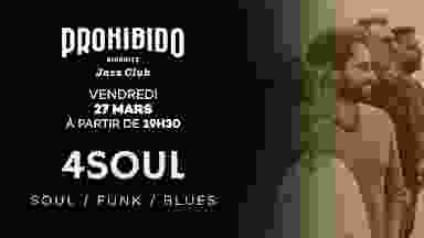 ✨ Une soirée Soul, Funk & Blues avec 4Soul – Vendredi 27 Mars ! ✨ Le vendredi 27 mars, venez vivre une parenthèse musicale chaleureuse, raffinée et pleine d’énergie avec 4Soul, un groupe de 4 musiciens passionnés et complices qui mêle avec élégance soul, funk et blues. Depuis les grandes heures de la Soul et du groove, cette musique fait vibrer par sa puissance, son feeling et son intensité. Avec 4Soul, place à une ambiance vivante, généreuse et accessible — idéale pour sublimer votre soirée tout en respectant l’identité et l’atmosphère du lieu. 🎶 4Soul, c’est : 🎤 Malou – Chanteuse solaire, habitée et généreuse 🎹 Steph – Claviériste virtuose et sensible 🎸 Gilles – Guitariste précis et inspiré 🥁 Max – Batteur au jeu fin et léger avec une énergie communicative Leur répertoire est à la fois exigeant et accessible, parfait pour créer une ambiance raffinée, chaleureuse, et faire monter le groove tout au long de la soirée. 📅 Quand ? Vendredi 27 Mars 📍 Où ? Prohibido Jazz Club de Biarritz 🕗 Horaires : Dîner dès 19h30 – concert 20h 🎶 Qui ? 4Soul : Malou (chant), Steph (claviers), Gilles (guitare), Max (batterie) Une soirée pour vibrer, sourire et se laisser porter par l’univers de 4Soul 🎵 (Pensez à réserver : les places partent vite !)