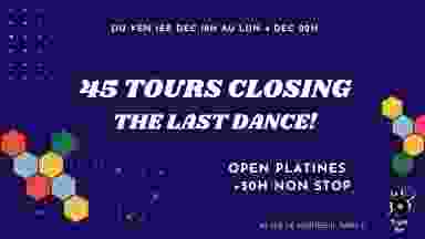Pour l’occasion, un dernier week end marathon comme seul le 45 Tours est capable de proposer se déroulera du Vendredi 01 Décembre 18h au Lundi 04 Décembre 02h, soit + de 50h de fête non stop!