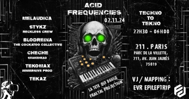 💀ACID FREQUENCIES : La Tête Qui Bouge X FraKtal Prøjection 💀 🗓02/11/2024 → 22H30 - 6H00 📍 211 : 211 Av. Jean Jaurès, 75019 Paris (Parc de la Vilette) La Tête Qui Bouge & FraKtal Prøjection s'associent le samedi 2 Novembre 2024 pour vous plonger dans une nuit aux sonorités brutales et authentiques 💣 Pas de compromis, juste du son pur et une immersion visuelle hypnotique ! Line-up : Techno to Tekno 🔊 Melaudica (FR) - Techno 🔊 Stykz (FR) - (Reckless Crew) - Acid Tekno 🔊 Blodreina (LBN) - (The Cockatoo Collective) - Tekno 🔊 Cheche (FR) - (LTQB) - Tekno/Hardcore 🔊 Tekomax (FR) - (Immersive Production) - Tekno 🔊 Tekaz (FR) - Hard Techno 👻VJ/Mapping : EVR Epileptrip 🔶Stands Tatoo / Halloween Make-up / RDR 🎃En cette période d’Halloween, les sonorités Acides prendront le contrôle de l’atmosphère pour une fête endiablée où l’horreur et le plaisir se rencontreront sur la piste de danse ! ☠ 🔶Billetterie : Super early à 5€ pour uniquement nos abonnées Shotgun La Tête Qui Bouge et Immersive Production ! (Quantité Limité) Early Ticket : 12€ + FDL Regular Ticket : 14€ + FDL Late Ticket : 16€ + FDL ℹInfos pratiques : Metro 5 arrêt porte de Pantin ☑Suivez-nous : Instagram : https://www.instagram.com/latetequibouge/ https://www.instagram.com/fraktal.projection/ https://www.instagram.com/immersive.productionfr/ Facebook : LTQB : https://www.facebook.com/profile.php?id=100093056345876 https://www.facebook.com/FraKtalProjection https://www.facebook.com/ImmersiveProduction Tiktok : @immersive.product 🟢Partenaires : @Showme event @techno_in_paris_underground @rhamax_