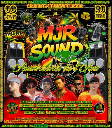 "OS MALDITOS SÃO DO CARALHOOOOOOO" Uga malditagem, equipe MJR Sound tem uma novidade daora pra todos vocês, dia 03/01(Sábado) teremos nosso aniversário de 1 ano de coletivo com um elenco fortíssimo representando a nossa comunidade!!! LINE UP🎙️💻🎶: •@mjr.soundzo •@keridos_ds •@dj.smagga •@gorilaboys.sound Mic: @lil.kell_br @uniqueotekashi @uniqueopirata @santos__7 @uniqueosouza @oartistaakyn @leao_jota Bilheteria🎟️: Antecipados 0800 via shotgun válidos até 23:30 (Limitados) $5 até 22h Após $10 A partir das 20h as 05h 🚨Regras🚨: ❌ desrespeito a outros participantes do evento ❌bebidas de fora (o local fornece bebidas a preços acessíveis de quebrada) ❌brigas (se caso alguém arrumar confusão, essa pessoa será gentilmente retirada a força) ❌pixo ❌No coca, No lança ✅✅🍀FREE SENSI🍁✅✅ Esperamos ter a sua presença conosco🤟🏻 -Valores acessíveis - line em peso - local de fácil acesso. Queremos ver nossos malditos curtindo a cultura de rua com a gente, venha!!!!!! ENDEREÇO📍: Avenida Washington Luiz, 143 Jd. Silveira - Barueri (Ao lado da estação jardim silveira, 5 min da estação) ‼️Pra quem vem de fora‼️ Ir sentido a estação “Barra funda” e mudar para a “linha 8 - Diamante” sentido “Itapevi” e descer na estação “Jardim Silveira”. Descendo da estação você segue sentido o "açougue do alemão" e segue reto sentido um restaurante de esquina à esquerda, continue subindo a rua e você encontra o pico do lado esquerdo da rua. (5 minutos andando da estação)