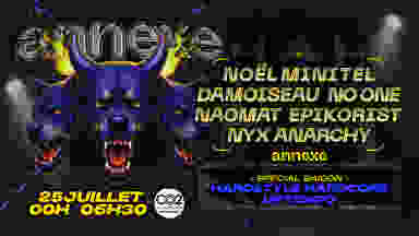 🚧 ANNEXE - SPECIAL SAISON HARDSTYLE HARDCORE UPTEMPO ! 🚧 👁️ Mapping XL 1er épisode d’une nouvelle saison lancé par le collectif ANNEXE : Cette fois-ci, un format HARDSTYLE, HARDCORE, UPTEMPO ! Échauffez-vous bien, on va faire roncher les enceinte du CO2. ❤️‍🔥TIMETABLE❤️‍🔥 > NOËL MINITEL / @noelminitel > DAMOISEAU / @damoiseau.mp3 > EPIKORIST / @epikorist_drillicit > NAOMAT / @naomathis_bcn > NO ONE / @no.onemusic._ > NYX ANARCHY @nyxanarchy.dj [ Respect, bienveillance et liberté : faisons vivre ensemble les valeurs des free-party ✨] 📅 Vendredi 25 Juillet ‣ 00h00 📍 CO2 @co2cluborigin.underground ‣ 3 Rue de la Cale Crucy, 44100 Nantes 🎟️ Préventes : https://shotgun.live/fr/venues/annexe 🖌️: @_skuskua