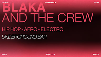 BLAKA & THE CREW 🔥 Blaka ramène toute son équipe pour une soirée taillée pour vous faire monter en température dès les premières minutes ⚡. Aux platines, une fusion explosive entre hip-hop, afro et sonorités électroniques, pour une ambiance rythmée, moderne et sans temps mort 🎧🌍. De 21h à 2h, le crew enchaîne les sets avec une seule mission : vous faire bouger non-stop 🕺💥. Attendez-vous à une énergie collective, des vibes puissantes et une vraie connexion avec le public. Rendez-vous à l’Underground Bar du Generator Paris pour une nuit immersive, festive et pleine de good vibes 🚀🍸
