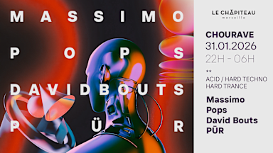 ♬ 🎪⚙️🔥⚙️🎪 ♬ ► Acid / Hard Techno / Hard Trance ► 22h00 – 06h00 ► 8H DE SON – FERMETURE 6H ► Pur sound system ► BAR – BIO, LOCAL et à petits prix ► HAPPY HOUR & ENTRÉE GRATUITE AVANT MINUIT (sur réservation) ♬ 🎪⚙️🔥⚙️🎪 ♬ La Chourave revient pour une nuit longue, dense et sans détour. Ici, on pousse le curseur un peu plus loin : des BPM qui montent, des basses qui frappent, des lignes acides qui vrillent les cerveaux… Une traversée nocturne pensée pour les corps en tension, les esprits lâchés et les danseur·euses qui tiennent jusqu’au bout de la nuit 🌒💥 8 heures de son, une montée progressive vers le chaos contrôlé, et une seule règle : tenir jusqu’à 6h. Prépare-toi à transpirer. La Chourave ne prévient pas, elle frappe. 😈🔊 — LINE UP — ⚙️ Massimo 💥 POPS 🌀 David Bouts ------- ⏰ TIMING 22h : Début des DJ sets 06h : Fermeture des portes 🌅💔 ------- 🍭 BILLETTERIE : GRATUIT AVANT 00H : Sur réservation NORMAL : 5€ + frais de loc LATE : 10€ + frais de loc SUR PLACE : 12€ ------- 💛 On prend soin les un·es des autres 💛 ➡ La musique s'arrête à 05h40 et on évite le bruit en quittant les lieux pour ne pas déranger les voisin·es : on vous attend donc on fire dès la première heure ! ➡ Tout comportement oppressif est banni du Chapiteau. On se réserve le droit de refuser toute personne ayant des comportements oppressifs et/ou discriminatoires. ➡ L'équipe se tient à votre disposition si vous subissez quelconque type d'agression / harcèlement ou vous sentez mal à l'aise vis-à-vis du comportement d'un·e personne. ➡ En achetant un billet, vous acceptez que des images de la soirée soient publiées sur les réseaux sociaux, dans des aftermovies ou albums photos. ☮ PEACE, LOVE & MUSIC !! Dans le respect, dans la joie, dans la musique !! --- INFOS PRATIQUES --- ► BAR - BIO, LOCAL et à petits prix à Marseille ► Accès : 38, Traverse Notre Dame de Bon Secours, 13003, Marseille Vélo : Station Vélib n°3320 à quelques mètres, Place Cadenas Bus : 31/32 arrêt “Place Caffo” | 33/34 arrêt “Belle de Mai Loubon” | 49 arrêt “Bernard Clovis Hugues” | 72 arrêt ‘’Plombières Notre Dame de Bon Secours"