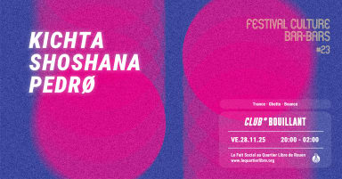 À l'occasion du Festival Culture Bar·Bars, on vous a concocté un line up bien trancy et bouncy comme on les aime. Pour ce Club Bouillant qui s'annonce brulant, on appelle à la barre le duo français le plus explosif du moment : 𝗞𝗜𝗖𝗛𝗧𝗔, la résidente du collectif parisien Galop Galop : 𝗦𝗛𝗢𝗦𝗛𝗔𝗡𝗔 ainsi que le rouennais : 𝗣𝗘𝗗𝗥𝗢.