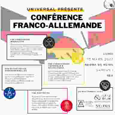[CONFÉRENCE FRANCO-ALLEMANDE] Néomiennes, Néomiens, Bonjour 👋 Un’iversal revient avec sa seconde conférence 2023, qui sera consacrée à l’amitié franco-allemandes, d’un point de vue historique et géopolitique.🎙 Cette conférence interactive sera animée par Monsieur Bozier, accompagné d’alumnis et de plusieurs intervenants dont Christian Vater, consul honoraire d’Allemagne à Reims et Doris Birkhofer, présidente & CEO chez Siemens France et membre du Praesidium de l’AHK. Ils nous présenteront les origines et les enjeux, défis et institutions de l’amitié franco-allemande, dans le cadre des 60 ans du Traité de l’Élysée. 🇫🇷🤝🇩🇪 En plus de la conférence, une exposition sera présentée du 13 au 17 mars afin de suivre les principaux jalons du franco-allemand et le rôle majeur de la ville de Reims dans cette amitié. 🏛 🗓 Lundi 13 mars 2023 🕠 De 18h à 20h 📍Campus 1 NEOMA BS REIMS La bise diplomatique 🕊