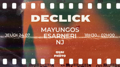 Quai de la Photo présente Declick, une toute nouvelle soirée qui vous laissera des images plein la tête. En collaboration avec NJ production, on vous propose le jeudi 24 juillet un dj set de 18h30 à 2h pour venir profiter en afterwork ou en pleine soirée. Line up MAYUNGOS ESARNERI NJ Profitez d’une soirée sur la seine au Quai de la photo, Jeudi 24 juillet à partir de 18H30 Tous les jeudis en période estivale. 9, port de la Gare M6 Quai de la Gare | M14 Bercy Accès au +18 ans