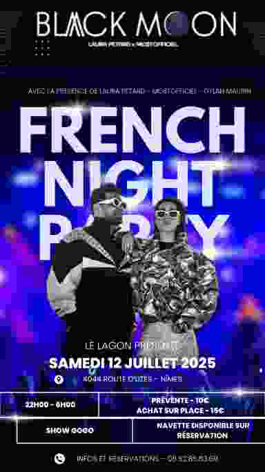 🎉 French Night Party 🇫🇷 📍 Le Lagon — 4044 route d'Uzès, 30000 Nîmes 📅 Samedi 12 juillet 2025 🕦 Ouverture des portes à 23h30 🔥 Ambiance French 🎧 Gest Laura Pétard & MostOfficiel aux platines 💃 Show Gogo en live ! 💥 Prépare-toi pour une nuit de folie ! 📲 06 52 85 83 69 Réserve ta table maintenant — soirée à ne pas manquer