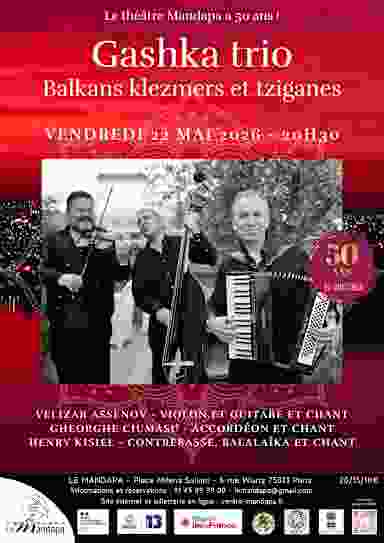 Gashka, c'est un trio envoûtant, à la rencontre des différentes cultures des Balkans. Et pour cause : Gashka signifie une belle bande de canailles en roumain ! Mais ce sont surtout ces magnifiques chansons tziganes, klezmer ou yiddish, un mariage heureux au cœur des racines de chacun des musiciens : Russie, Moldavie, Bulgarie, Pologne et Ukraine. Fort de cet héritage, Gashka est une invitation au voyage, à l'espérance, aux émotions, privilégiant en toutes circonstances la force de la vie par la musique. Velizar Assenov, né dans une famille de musiciens, a baigné dès son plus jeune âge dans l'univers de la musique. Dès l'âge de cinq ans, il commence son apprentissage au violon sous la tutelle de sa maman, elle-même violoniste confirmé. Son talent et son dévouement le conduisent à intégrer le conservatoire national de région CNR de Versailles, oui poursuit son apprentissage du violon. En 1999, il est récompensé par l'obtention d'un prix de musique soulignant ainsi son excellence et son engagement dans son art. Toujours en quête d'excellence, Velizar Assenov poursuit sa formation en se perfectionnant auprès de Maurice moulin au CNR de Rueil-Malmaison, afin d'affiner sa technique et d'exploiter de nouveaux horizons musicaux. Au fil des années Velizar développe une profonde connaissance de la musique traditionnelle de l'Europe de l'Est, un domaine qui le passionne et qui nourrit son inspiration artistique. Cette fascination pour les riches traditions musicales de sa région d'origine se reflète dans son travail artistique, et il enchante son public à travers une série de projets artistiques variés et captivant. Né en Moldavie, Gheorghe Ciumasu est diplômé de l’Université des Beaux-Arts de Chisinau (direction de chœur, pédagogie musicale, accordéon). Il enseigne l’éveil musical et l’accordéon et dirige l’orchestre Struguras de Valcinet (musique traditionnelle moldave). Arrivé en France en 2001, il développe son activité d’interprète et se produit sur des répertoires très variés (musiques russes, tsigane, balkanique, klezmer, musette, chanson française, séfarade, fado, tango). À Paris, il a notamment joué dans les lieux suivants : Cité de la Musique, cabaret russe Raspoutine, le Train Bleu, la Mascotte, la Coupole, le Théâtre Essaïon, les Trois Baudets, la Bellevilloise, la Marbrerie de Montreuil, les Yachts de Paris et pour la chaîne de télévision Paris Première. Il a accompagné les groupes et interprètes suivants : Ben Zimet, Bielka, Michèle Tauber, Nicolas Kedroff, Rona Hartner, Nedim Nalbantoglu, Ghenadie Negru, Violaine Lochu, Pletzl Bandits, Gasska. Henry Kisiel joue de la contrebasse et de la balalaïka, il est également professionnel dans le domaine du coaching, de la psychologie et du conseil en ressources humaines. Depuis 2021, il dirige Jazz & Soul Conseil, où il accompagne ses clients dans le développement personnel et professionnel, tout en animant l'émission Yiddish Glick sur RadioJ, où il fait redécouvrir le patrimoine musical juif à travers les œuvres des grands chanteurs et musiciens yiddish.