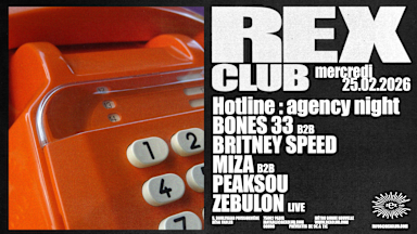 Dring… L’appel résonne dans la nuit. Au bout du fil : le Rex Club. À l’autre extrémité : Hotline Agency. Après une première transmission sous l’Échapodrome, Hotline Agency reprend la ligne et investit l’institution parisienne pour une nuit sous haute tension. Signal clair, fréquence brute, aucune interférence : la connexion est établie. ➤ LINE UP BRITNEY SPEED B2B BONES33 PEAKSOU B2B MIZA ZEBULON Live ➤ Techno | Trance | Groove and more _____ ☎Plus d’informations : vaiana.hotlineagency@gmail.com